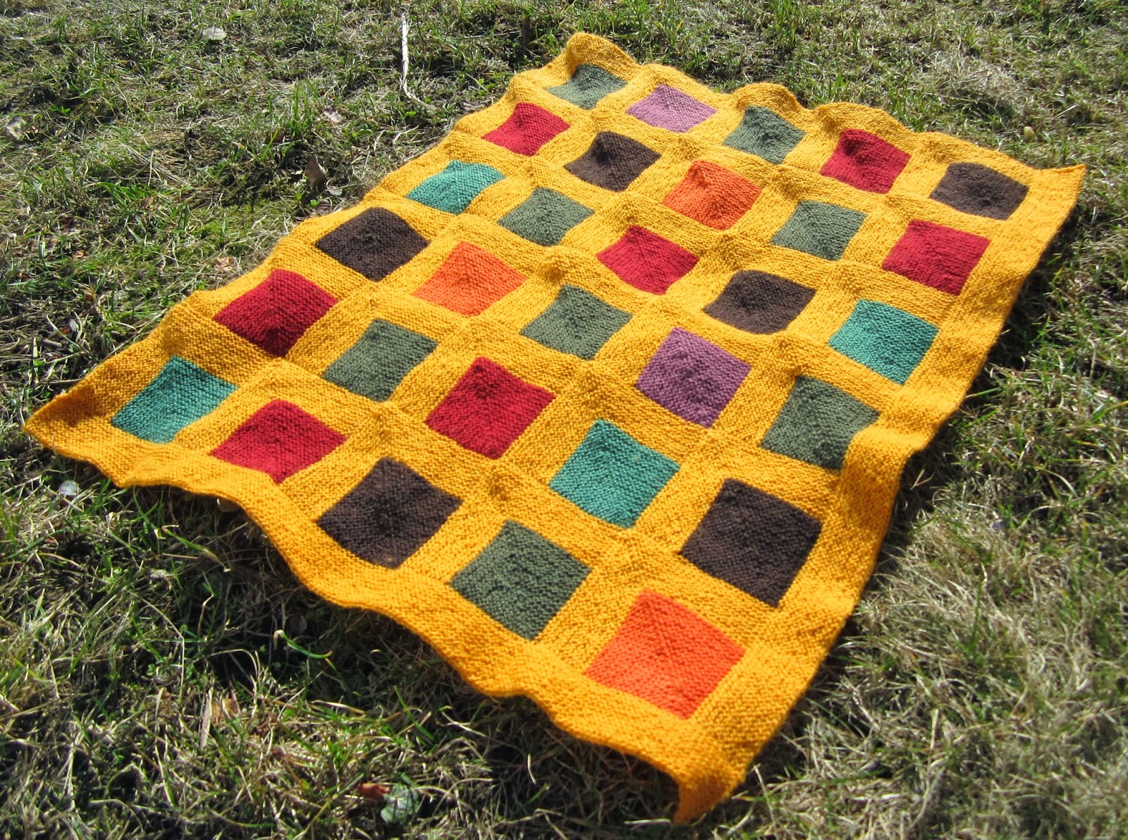 Huonolla värisilmälläni kasasin yhteen kaikki mahdolliset samanpaksuiset jämät ja keräkasan keskellä tajusin, että sieltähän löytyi läjä mausteisia värejä, joten heitin kaikki valkoiset ja tummansiniset mäkeen. Neuloessa oli koko ajan valtava into nähdä, millainen seuraavasta neliöstä syntyy ja niinpä jumiuduin muutamaksi viikoksi neulomaan pelkästään tätä peittoa. Oli muuten loistava telkkari- ja surffausneule! Täytyy kai aloittaa toinenkin, lankaa kyllä riittää!